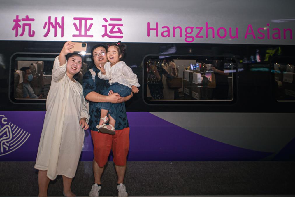 9月16日,在杭州東站站臺(tái),乘客與復(fù)興號(hào)亞運(yùn)智能動(dòng)車組列車合影留念。 新華社記者 江漢 攝