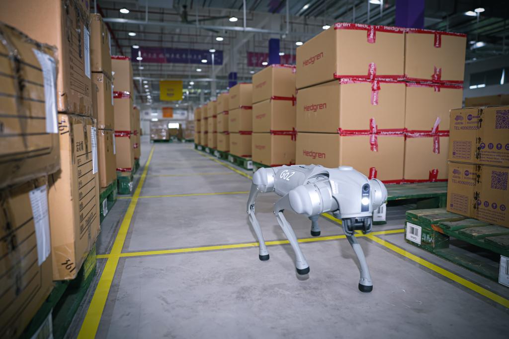 9月13日,機(jī)器狗在杭州亞運(yùn)會(huì)物流中心內(nèi)執(zhí)行巡檢工作。新華社記者江漢 攝