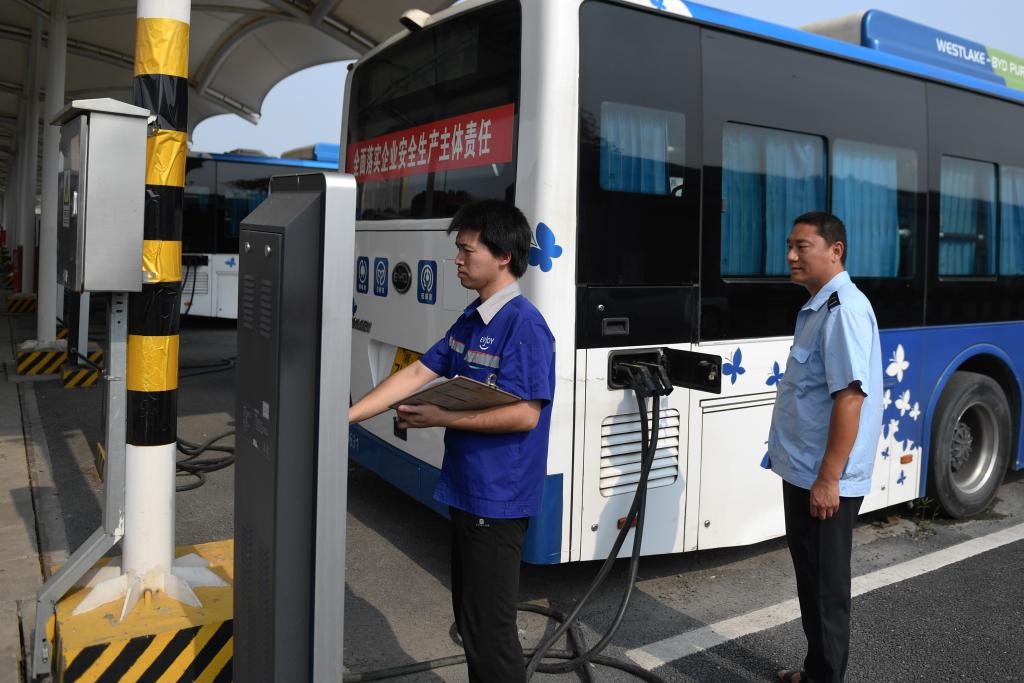 工作人員(左)在杭州公交電車公司拱康路維保站檢查純電動公交車的充電情況。新華社記者黃宗治 攝