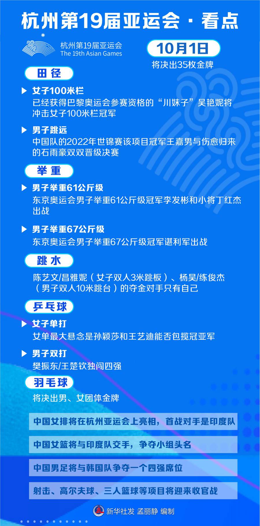 新華社杭州9月30日電(記者王恒志 張澤偉)杭州第19屆亞運(yùn)會(huì)10月1日將決出35枚金牌,恰逢國(guó)慶,中國(guó)體育健兒將在多個(gè)項(xiàng)目上沖擊金牌。田徑賽場(chǎng)“顏值擔(dān)當(dāng)”吳艷妮將挑戰(zhàn)自己的首個(gè)亞運(yùn)會(huì)冠軍,中國(guó)女排將迎來首場(chǎng)比賽,跳水、舉重、乒乓球等幾支“夢(mèng)之隊(duì)”也將繼續(xù)登場(chǎng)。
