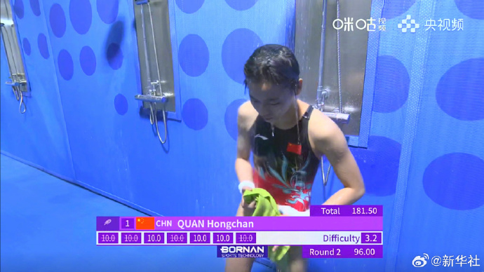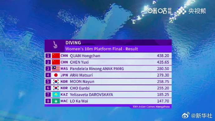 在3日進行的杭州亞運會跳水女子10米臺決賽中,全紅嬋最后一跳逆轉(zhuǎn)奪金,陳芋汐摘銀。(記者:周欣 夏亮)