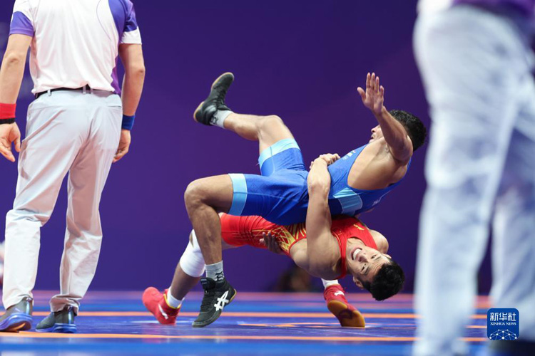 當(dāng)日,在杭州亞運會摔跤項目男子古典式77公斤級四分之一決賽中,中國選手劉瑞戰(zhàn)勝印度選手維卡斯,晉級半決賽。