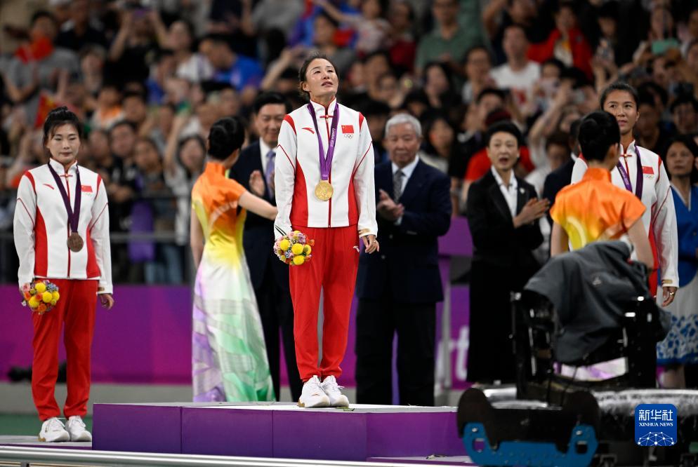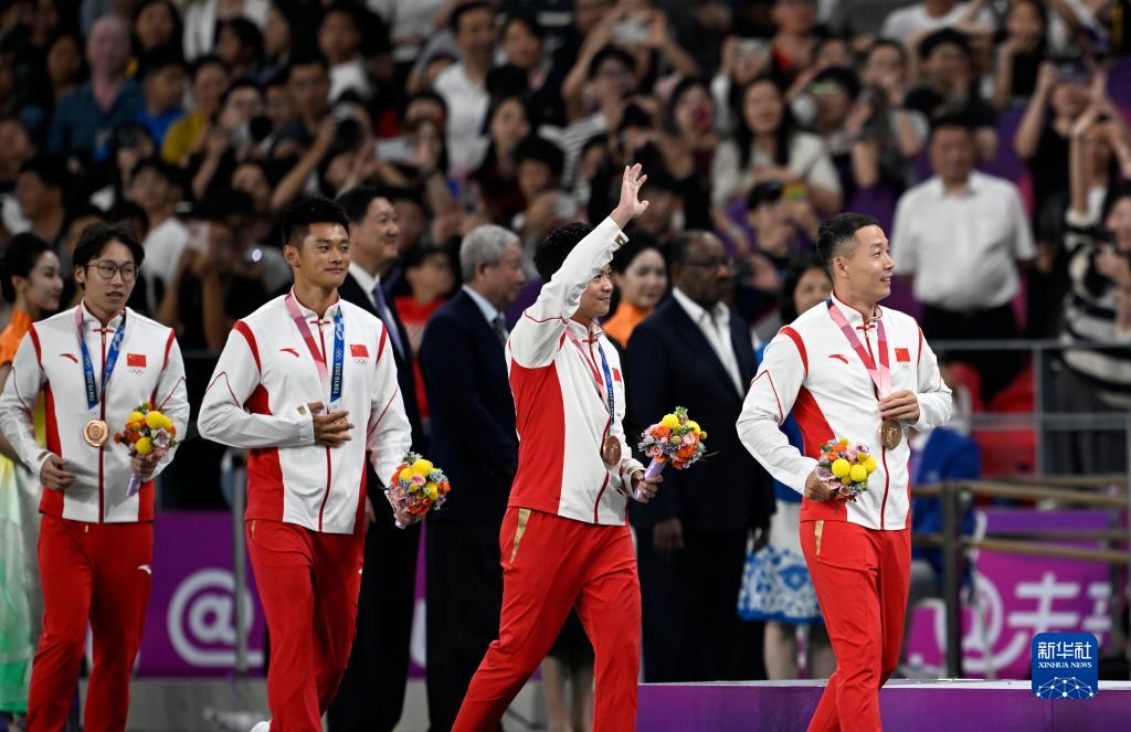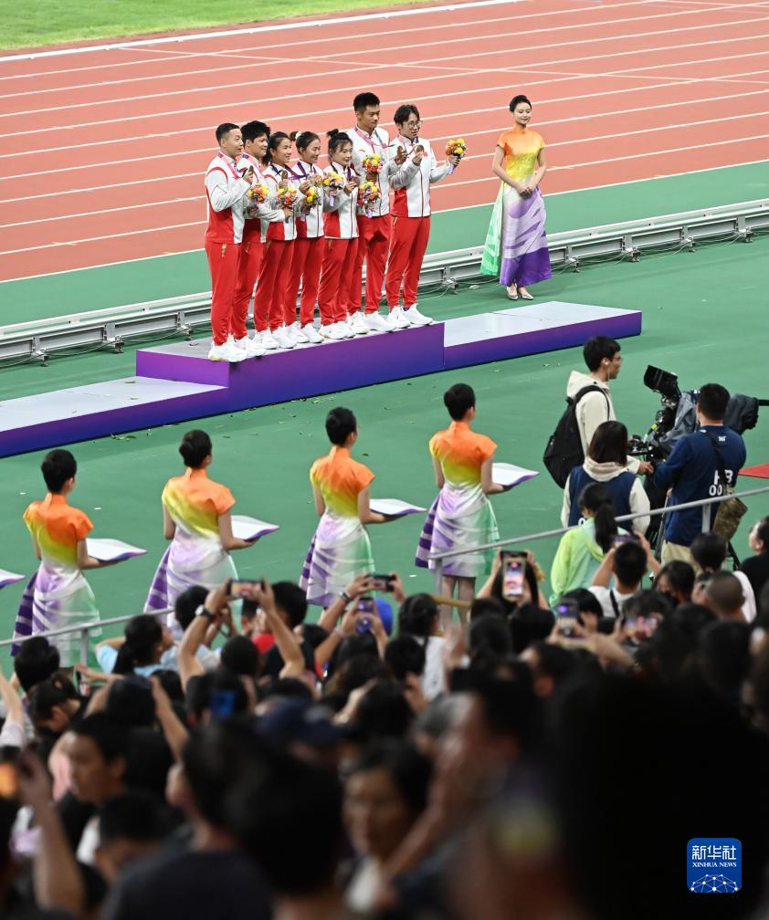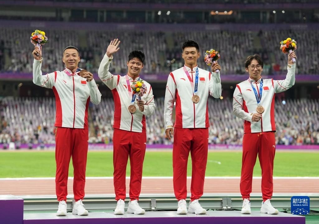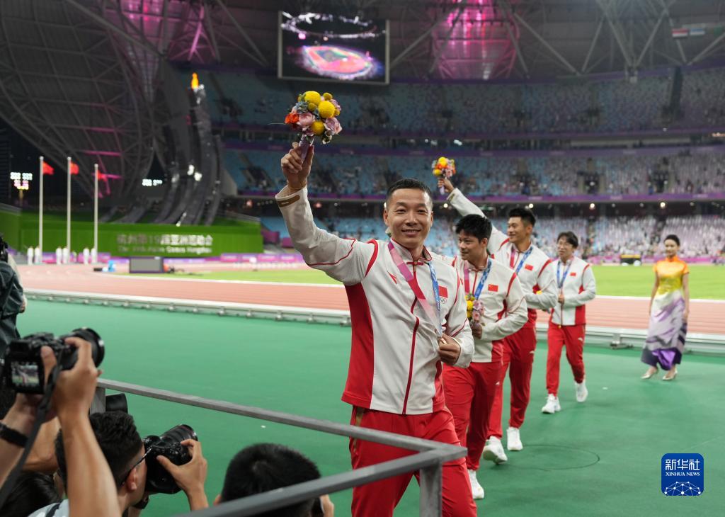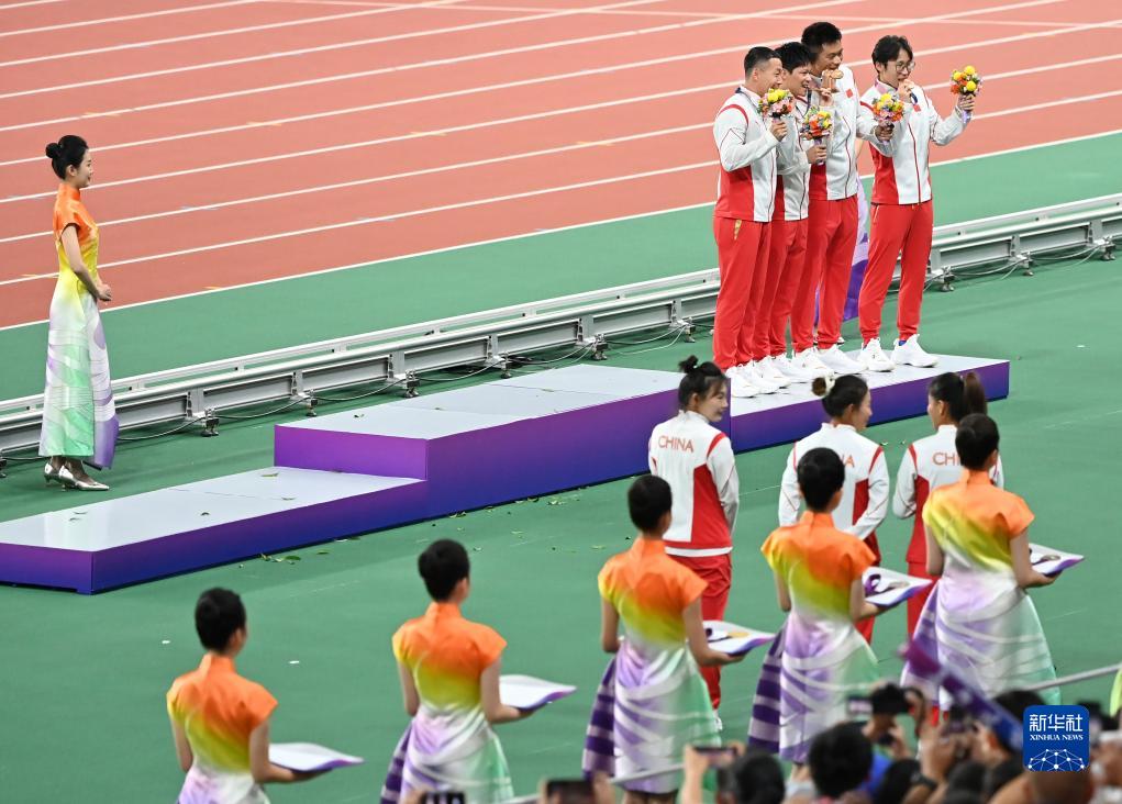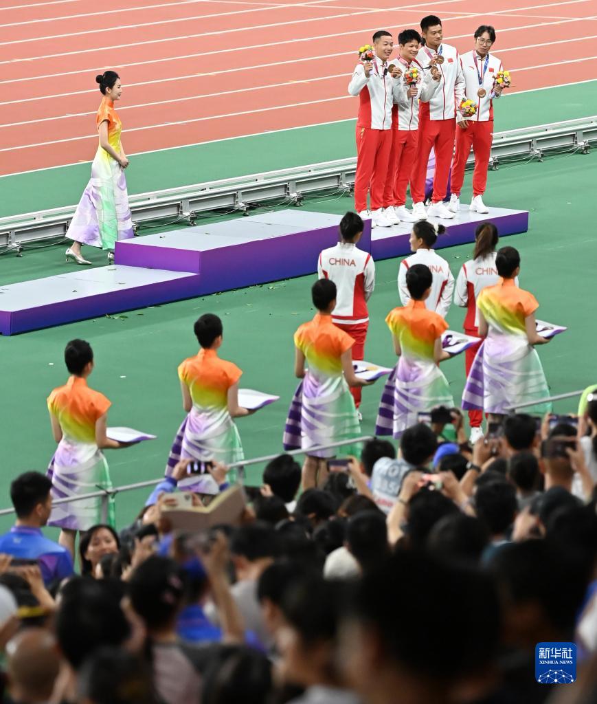 當(dāng)晚,杭州亞運(yùn)會(huì)田徑項(xiàng)目比賽結(jié)束后,中國(guó)奧委會(huì)在杭州奧體中心體育場(chǎng)舉行遞補(bǔ)奧運(yùn)獎(jiǎng)牌頒獎(jiǎng)儀式,為遞補(bǔ)獲得東京奧運(yùn)會(huì)男子4X100米接力銅牌的蘇炳添、謝震業(yè)、吳智強(qiáng)和湯星強(qiáng)與遞補(bǔ)獲得2012年倫敦奧運(yùn)會(huì)女子20公里競(jìng)走金、銀、銅牌的切陽(yáng)什姐、劉虹、呂秀芝頒發(fā)獎(jiǎng)牌。