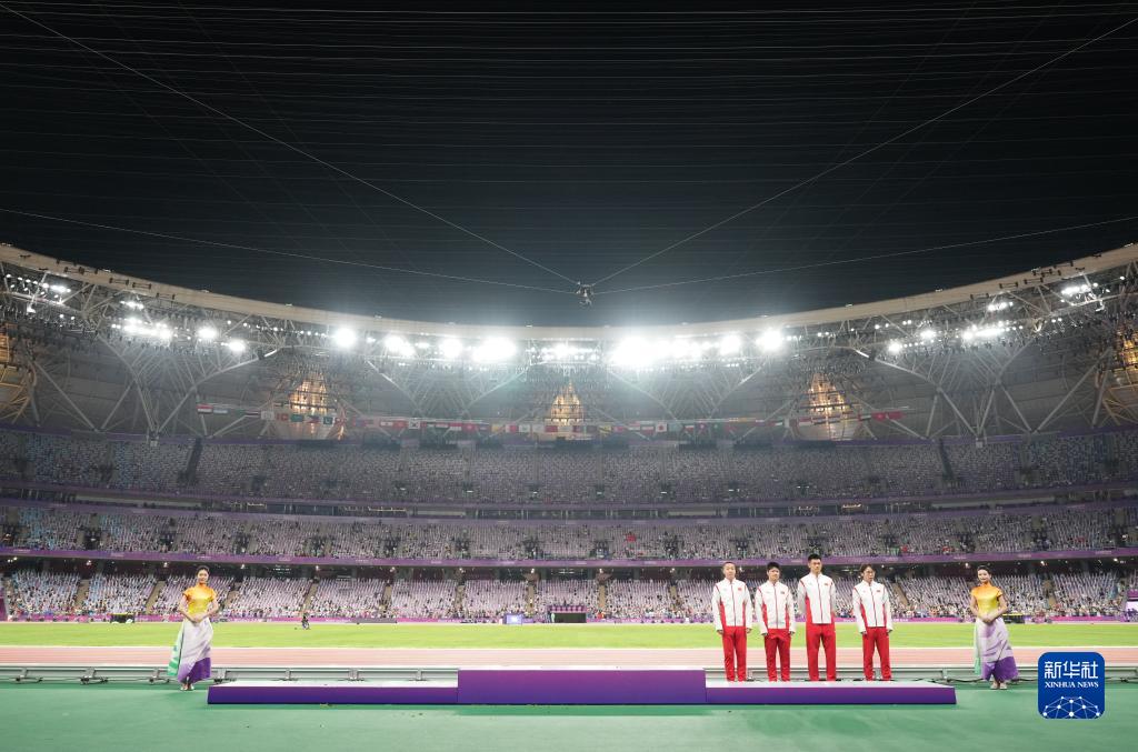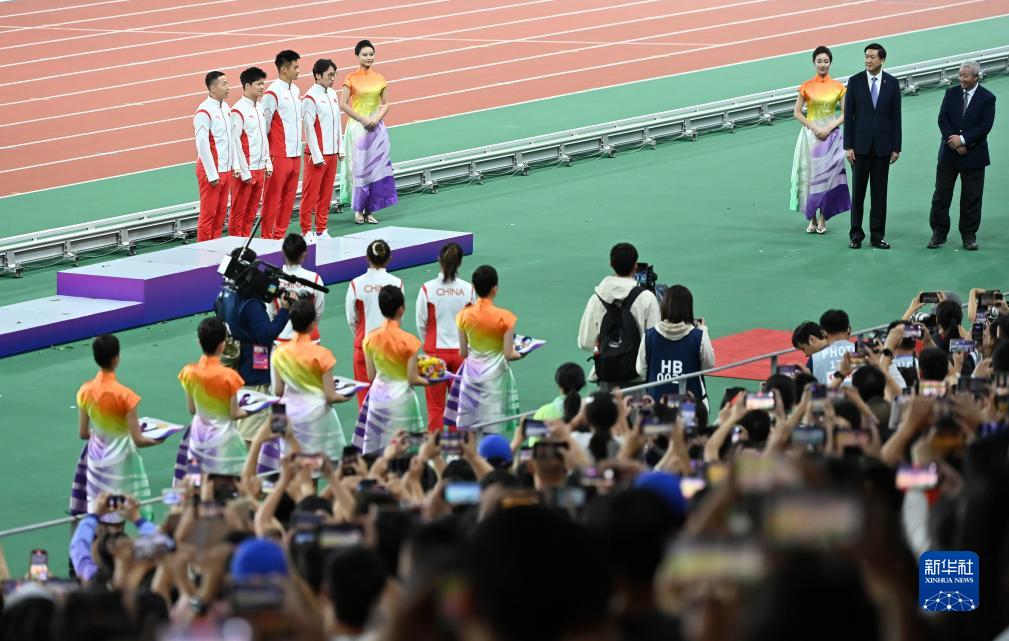 10月4日,湯星強(qiáng)、謝震業(yè)、蘇炳添、吳智強(qiáng)(頒獎(jiǎng)臺(tái)后從右至左)在頒獎(jiǎng)儀式上。