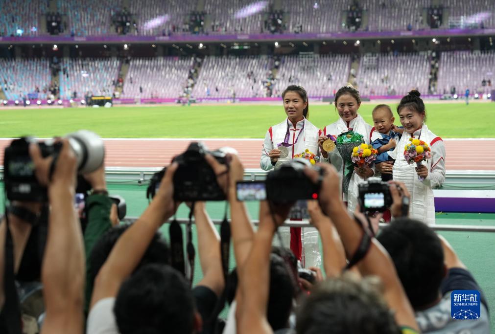 10月4日,切陽(yáng)什姐(中)、劉虹(右)、呂秀芝(左)在頒獎(jiǎng)儀式后展示獎(jiǎng)牌。