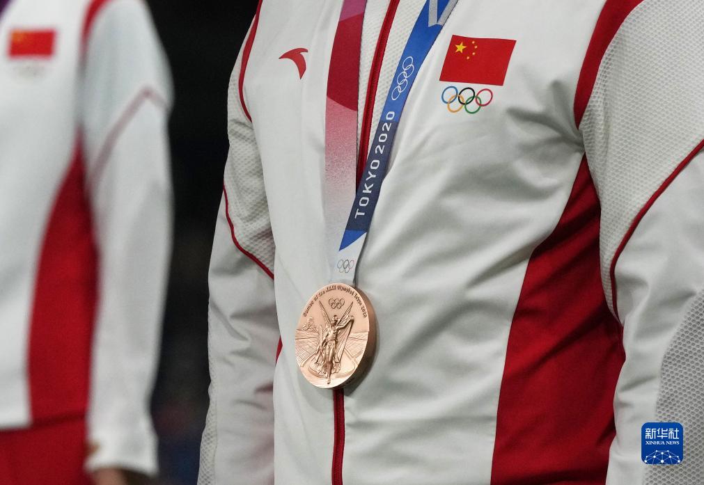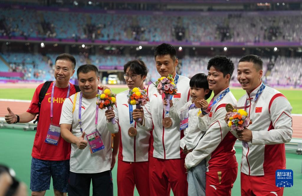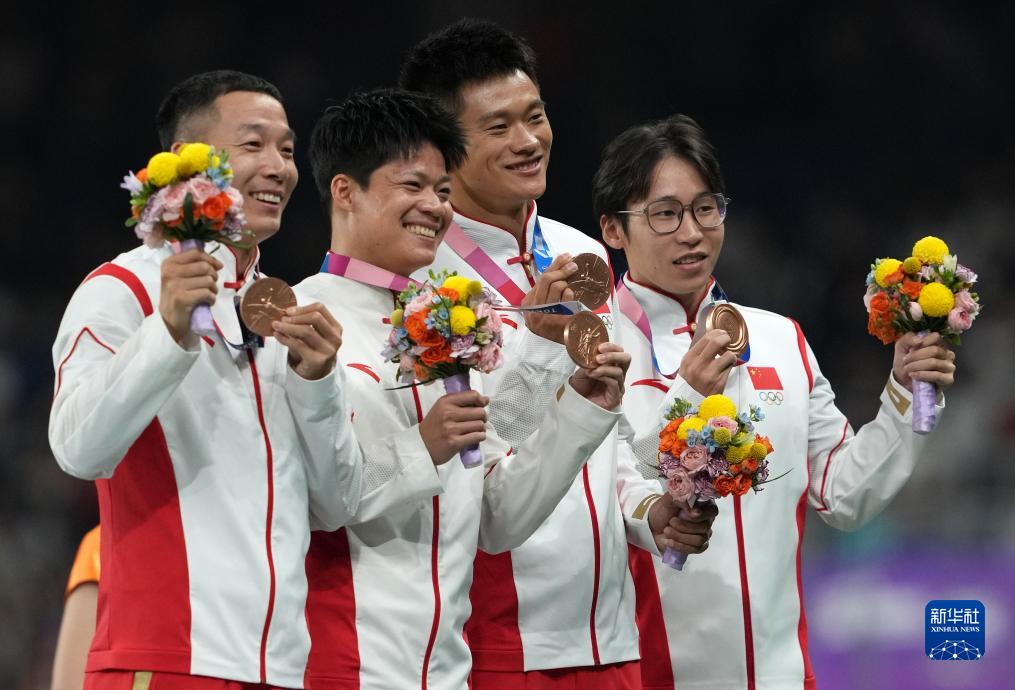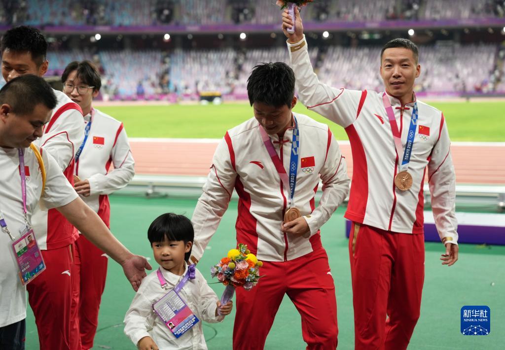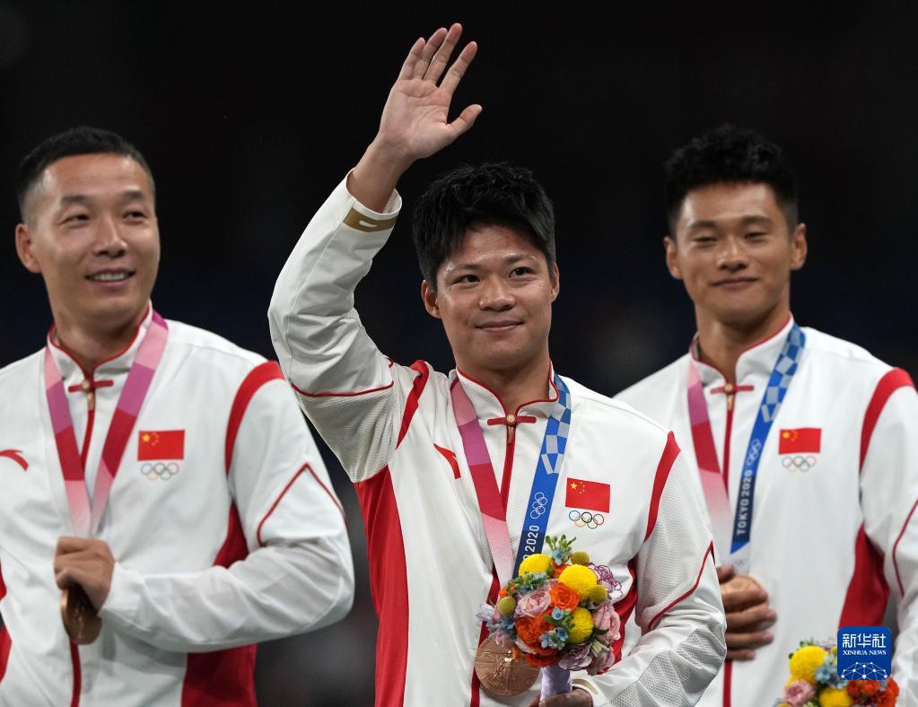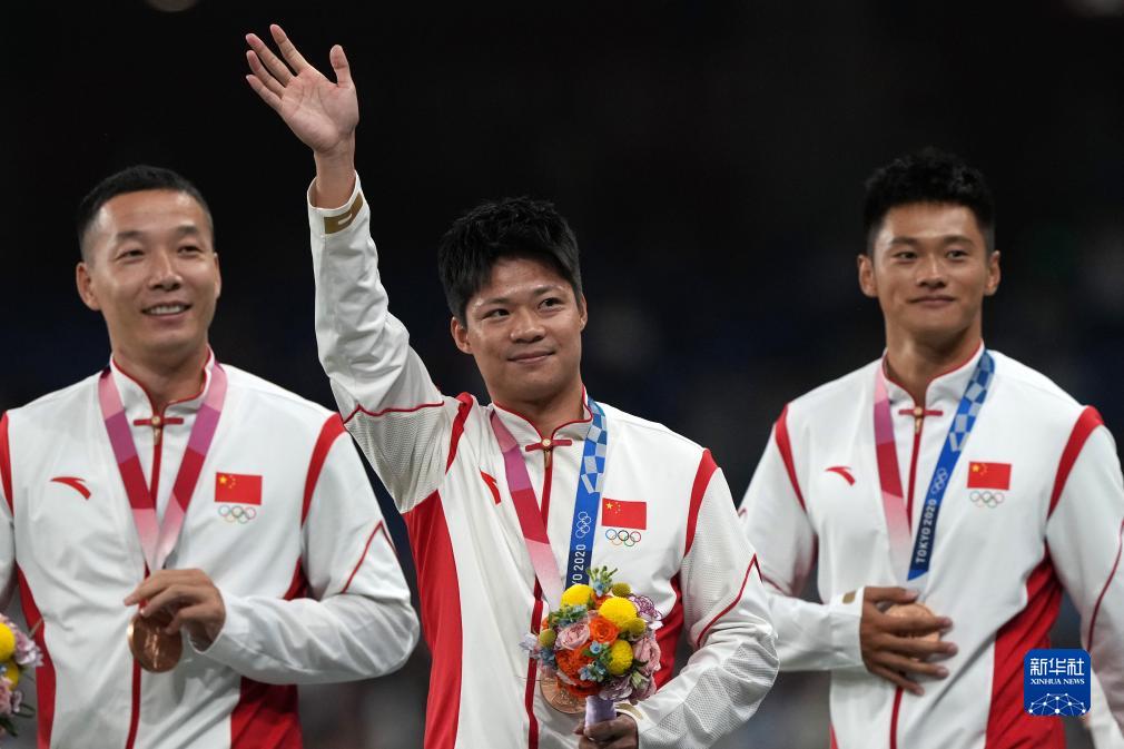 這是湯星強(qiáng)、謝震業(yè)、蘇炳添、吳智強(qiáng)遞補(bǔ)獲得的東京奧運(yùn)會(huì)男子4X100米接力銅牌(10月4日攝)。