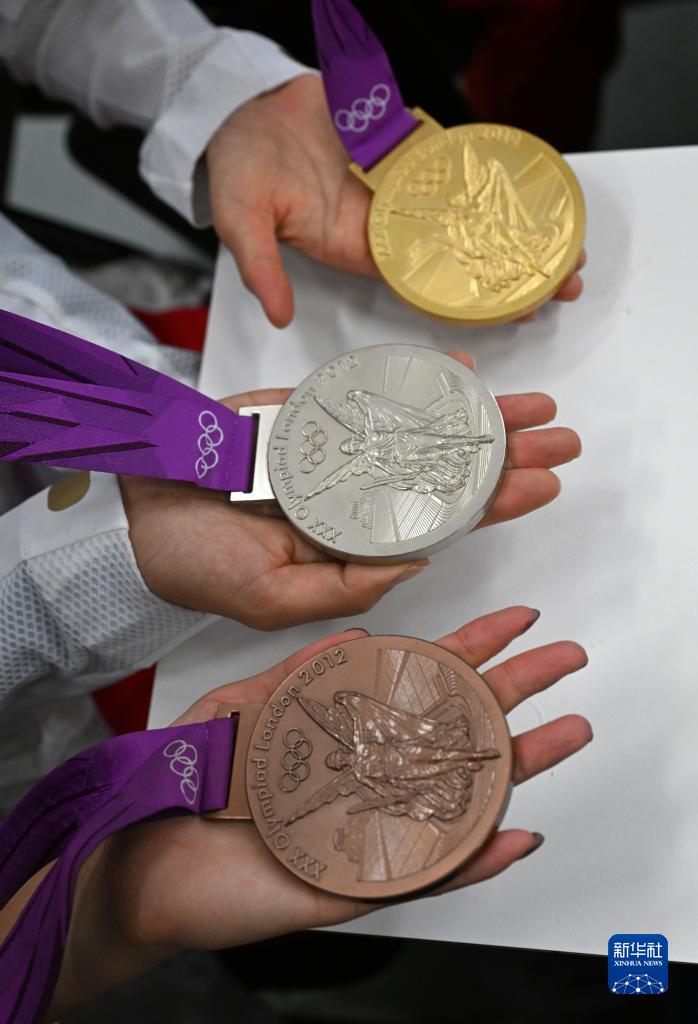 這是切陽(yáng)什姐、劉虹、呂秀芝遞補(bǔ)獲得的2012年倫敦奧運(yùn)會(huì)女子20公里競(jìng)走金、銀、銅牌(10月4日攝)。
