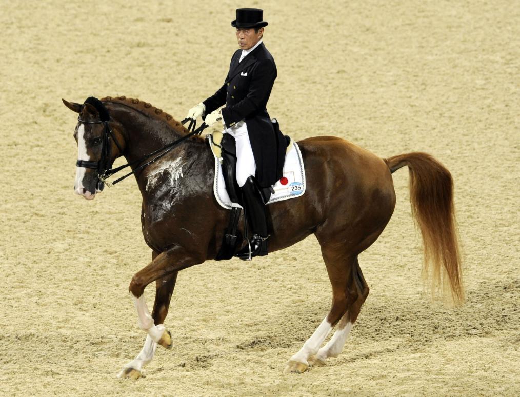 2008年8月14日,時(shí)年67歲的日本騎手法華津?qū)捲诒本W運(yùn)會比賽中。新華社記者呂小煒攝