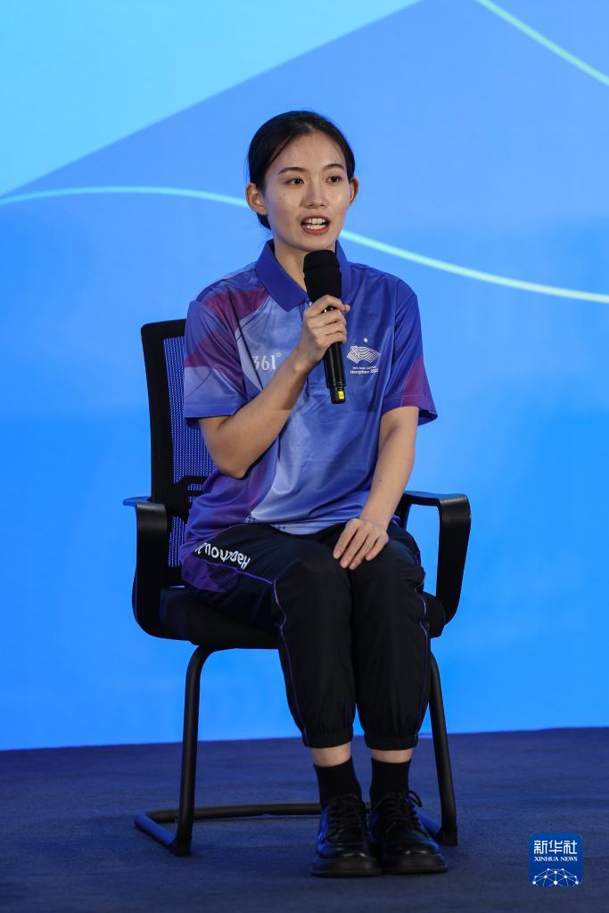 10月7日,杭州奧體中心籃球館競賽志愿者李冠霖在見面會現(xiàn)場發(fā)言。