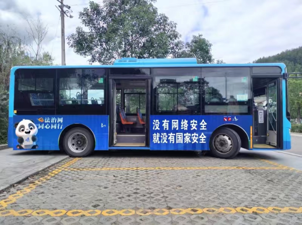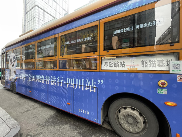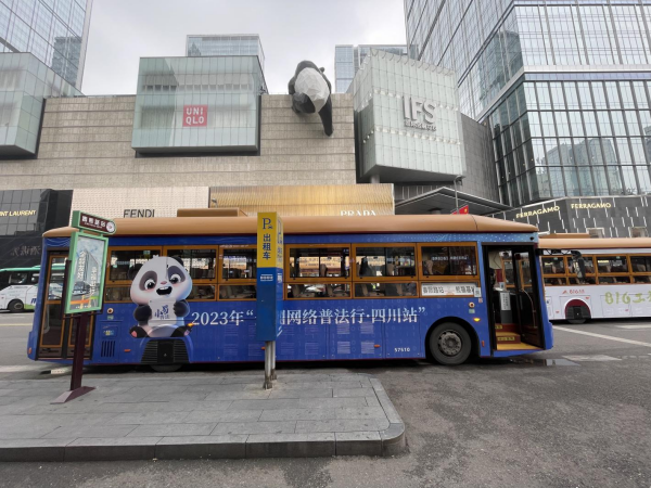 據(jù)介紹,未來一個月時間里,成都市民和來蓉游客都能在春熙路商圈的“網(wǎng)紅”地標“熊貓爬墻”下,看到網(wǎng)絡普法主題公交。該主題公交在成都著名的“熊貓觀光線”上運行,并往返于成都地標春熙路以及熱門景點熊貓基地,途經(jīng)寬窄巷子、文殊院等人氣打卡地,公交車化身普法“宣傳員”,讓網(wǎng)絡普法宣傳融入城市交通、深入大街小巷、進入百姓心中。