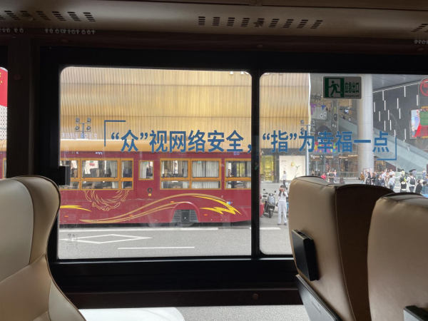在網(wǎng)絡普法公交的車窗上,也“隱藏”著網(wǎng)絡普法金句——“眾”視網(wǎng)絡安全,“指”為幸福一點!隨著車輛在大街小巷間穿梭,沉浸式學法帶給每位乘客全新的體驗,普法真正“動”了起來。