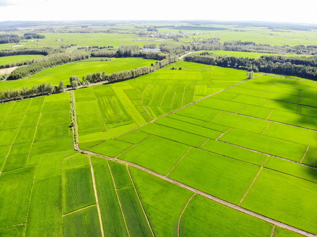 2022年7月,黑龍江省鐵力市山泉農機農民專業(yè)合作社高標準有機稻田(無人機照片)。新華社記者王松 攝