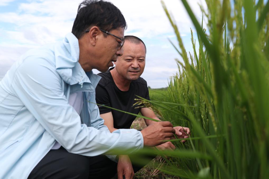 2023年8月,黑龍江省尚志市農業(yè)技術推廣中心的工作人員在當?shù)匾惶幈缓樗葸^的水稻田里查看水稻情況。新華社記者張濤 攝