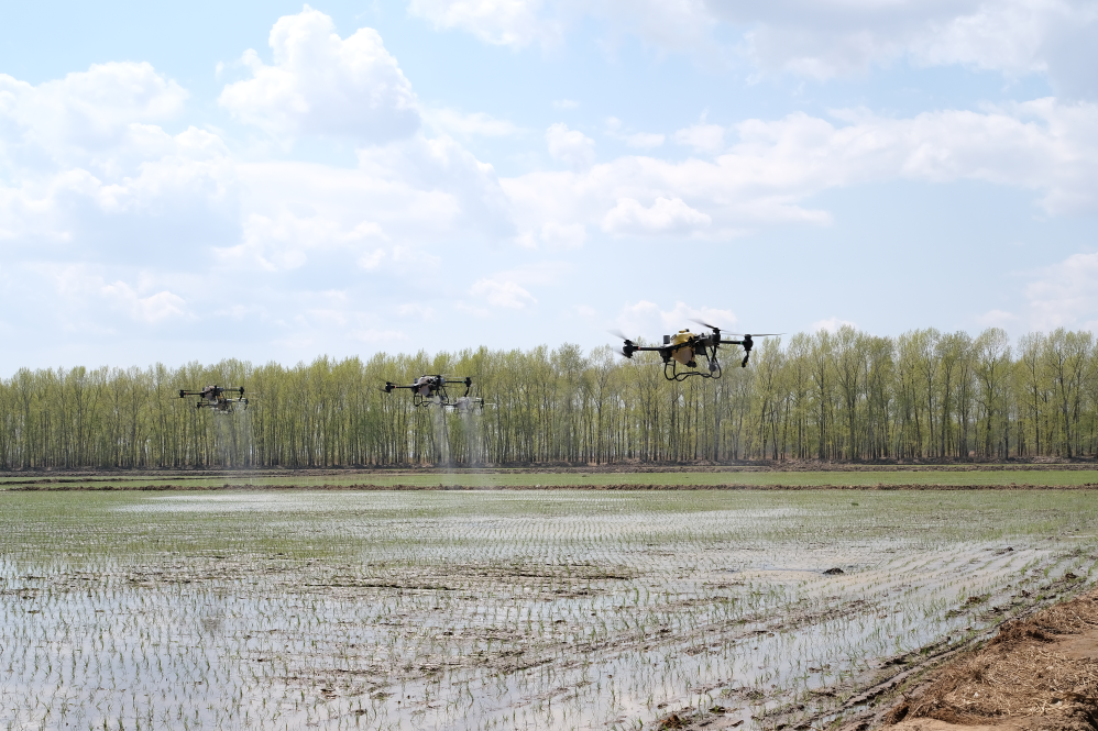 2023年5月,北大荒集團軍川農場有限公司正使用植保無人機對剛剛插秧的地塊噴施液態(tài)返青肥。新華社記者黃騰 攝