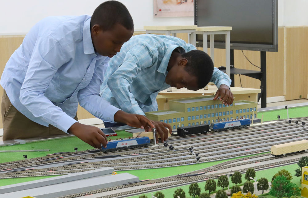在位于吉布提首都吉布提市的吉布提工商學校,學生在魯班工坊鐵道運營沙盤教學區(qū)學習(2022年9月19日攝)。新華社記者 董江輝 攝