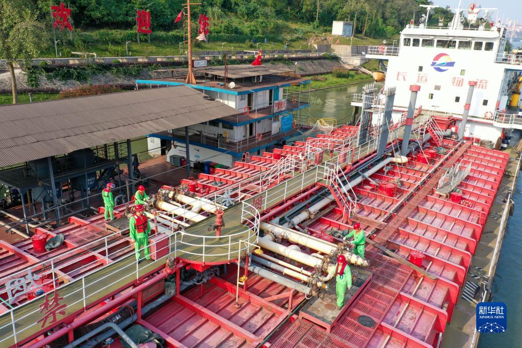 10月17日,在中國石化集團重慶川維化工有限公司物流碼頭,出口的產(chǎn)品正在裝船(無人機照片)。