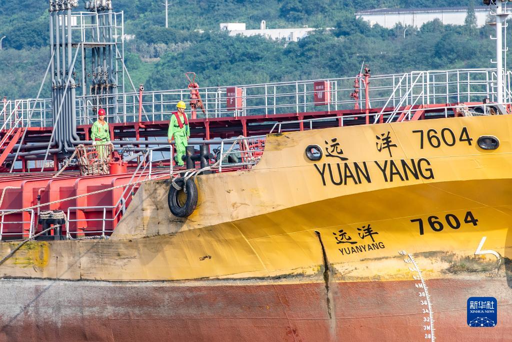 10月17日,在中國石化集團重慶川維化工有限公司物流碼頭,工作人員在檢查出口產(chǎn)品裝船情況。