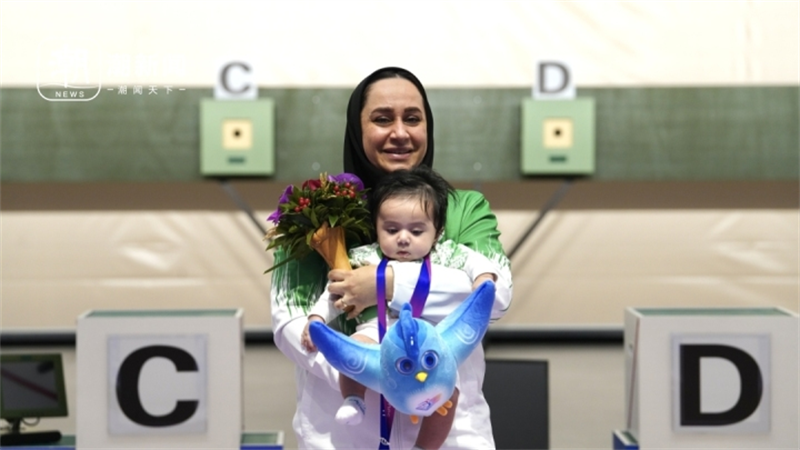 10月24日傍晚,富陽銀湖體育中心,杭州亞殘運會射擊項目SH1級女子10米氣手槍頒獎儀式上,銀牌得主、杭州亞殘運會伊朗代表團(tuán)射擊運動員薩雷赫?賈萬馬爾迪一出場,就引得現(xiàn)場一片歡呼。