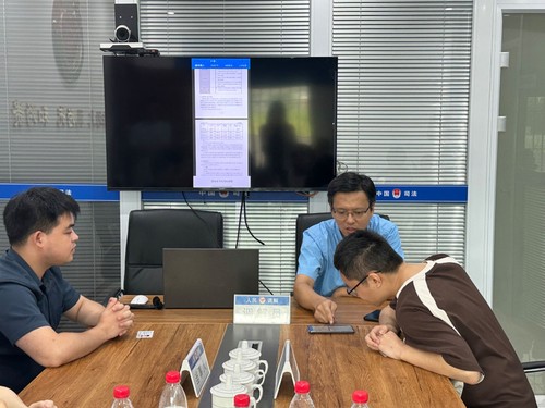 調(diào)解員安廣泉(中)運(yùn)用“智慧調(diào)解系統(tǒng)”調(diào)解一起民間借貸糾紛案。人民政協(xié)網(wǎng)記者王慧文 攝