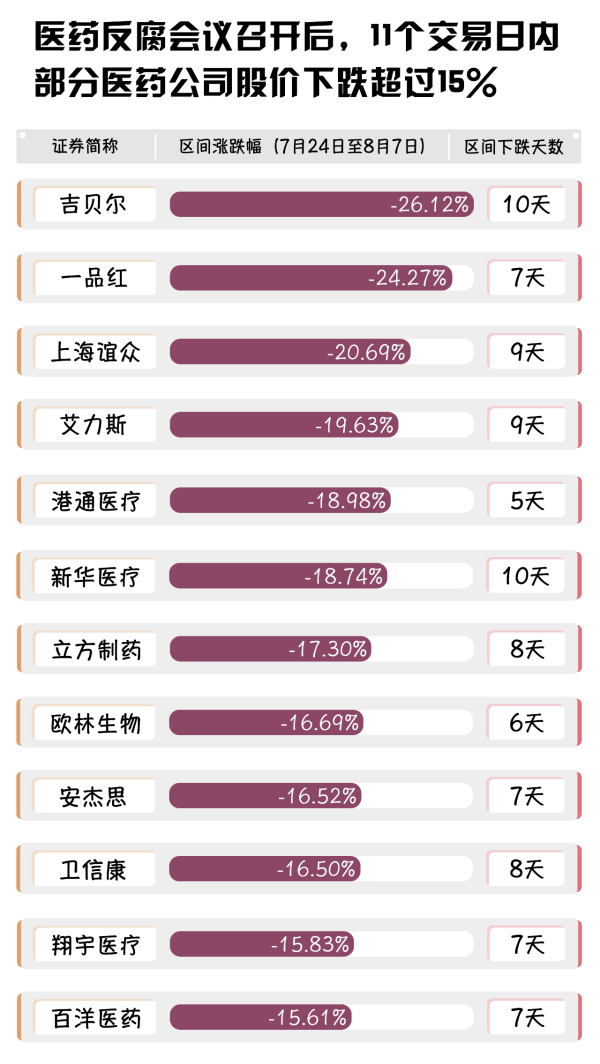 自7月21日,國家衛(wèi)健委聯(lián)合多部門召開醫(yī)藥反腐整治會(huì)議后,藥企所受到的沖擊可從股市中窺探一二。根據(jù)wind(萬得)發(fā)布的數(shù)據(jù)來看,從會(huì)后的第一個(gè)交易日(7月24日)以來,11個(gè)交易日內(nèi),共有12家醫(yī)藥企業(yè)股價(jià)跌幅超過15%,其中11家藥企股價(jià)下跌天數(shù)在7天及以上。