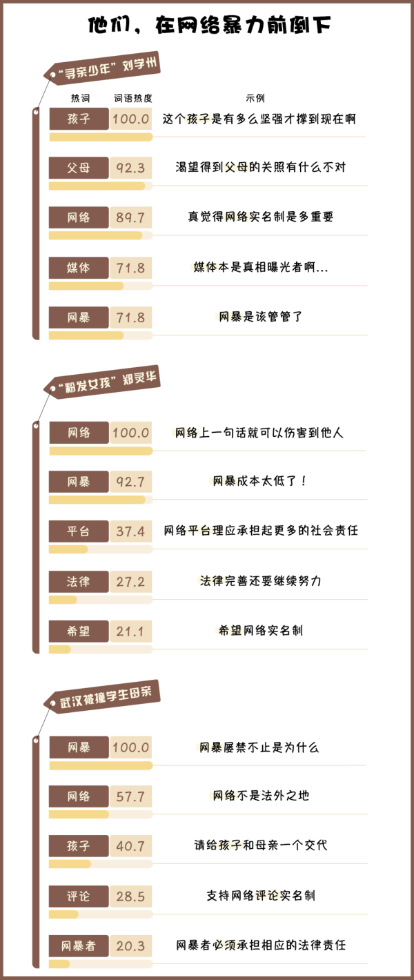 近年來,因網(wǎng)絡暴力導致的悲劇事件頻出,例如“尋親少年”劉學州因與親生父母親的矛盾遭受網(wǎng)絡暴力,最終選擇留下一封“來時即輕,還時亦凈”的遺書后自殺;“粉發(fā)女孩”鄭靈華因染粉色頭發(fā)被網(wǎng)暴導致嚴重抑郁,抗爭無果后選擇結束自己的生命;武漢被撞致死小學生的母親從高樓一躍而下,去世前曾遭遇惡意評論。