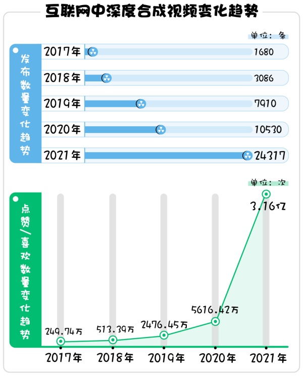 上一次人們感嘆人工智能的強大,還要追溯到2016年,阿爾法圍棋(AlphaGo)成為了第一個擊敗圍棋世界冠軍的人工智能機器人,深度學(xué)習(xí)的威力開始顯現(xiàn)。在此后的幾年,深度合成技術(shù)被廣泛應(yīng)用于各個領(lǐng)域。以互聯(lián)網(wǎng)中深度合成視頻為例,根據(jù)清華大學(xué)人工智能研究院聯(lián)合多家單位發(fā)布的《深度合成十大趨勢報告(2022)》顯示,近幾年,互聯(lián)網(wǎng)中深度合成視頻的發(fā)布與傳播數(shù)量呈現(xiàn)高速增長的態(tài)勢。