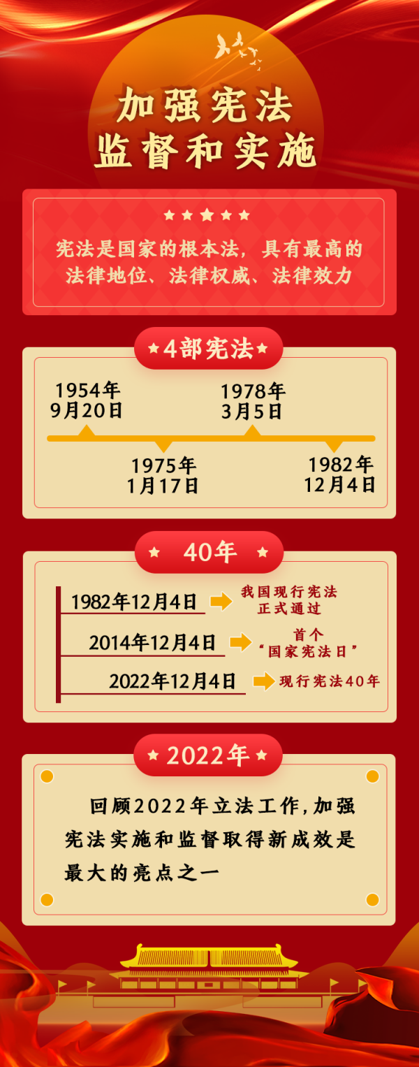 2022年是我國現(xiàn)行憲法公布施行40周年。這40年,也是我國改革開放深入推進(jìn)、經(jīng)濟(jì)社會迅速發(fā)展、人民生活水平不斷提高的40年。回顧2022年立法工作,加強憲法實施和監(jiān)督取得新成效是最大的亮點之一。具體包括,不斷健全保證憲法全面實施的制度體系,通過完備的法律保證憲法實施,嚴(yán)格落實合憲性審查制度機(jī)制,深入推進(jìn)合憲性審查工作,更好發(fā)揮憲法在治國理政中的重要作用,維護(hù)憲法權(quán)威和尊嚴(yán)。