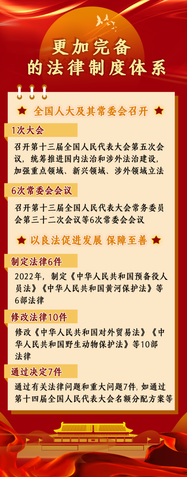 據(jù)統(tǒng)計,2022年,全國人大及其常委會召開了1次大會和6次常委會會議,統(tǒng)籌推進(jìn)國內(nèi)法治和涉外法治建設(shè),加強重點領(lǐng)域、新興領(lǐng)域、涉外領(lǐng)域立法,制定法律6件,修改法律10件次,作出法律解釋1件,通過有關(guān)法律問題和重大問題決定7件,法律制度體系更加完備。