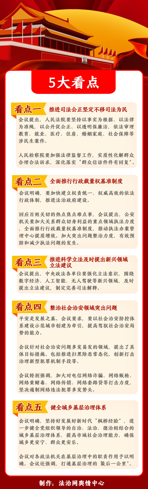 根據(jù)新華網(wǎng)發(fā)布的文章,本次會(huì)議聚焦2023年政法工作五大看點(diǎn):推進(jìn)公正司法,堅(jiān)定不移司法為民;全面推行行政裁量權(quán)基準(zhǔn)制度;推進(jìn)科學(xué)立法及時(shí)提出新興領(lǐng)域立法建議;整治社會(huì)治安領(lǐng)域突出問(wèn)題;健全城鄉(xiāng)基層治理體系。