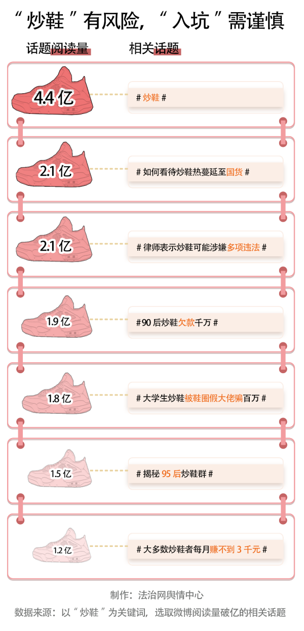 微博話題“揭秘95后炒鞋群”的相關(guān)閱讀量達(dá)到了1.9億,其中,有些95后炒鞋者靠“炒鞋”一夜暴富,也有不少炒鞋者虧得血本無歸,甚至有炒鞋者卷入經(jīng)濟(jì)糾紛或涉嫌違法。