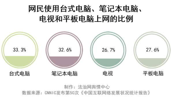 隨著智能手機(jī)普及,移動(dòng)網(wǎng)絡(luò)速度大幅提升,網(wǎng)絡(luò)接入環(huán)境變得多元。據(jù)第50次《報(bào)告》顯示,我國(guó)手機(jī)網(wǎng)民已達(dá)到10.47億,占總體的99.6%;使用臺(tái)式電腦、筆記本電腦、電視和平板電腦上網(wǎng)的比例分別為33.3%、32.6%、26.7%和27.6%。