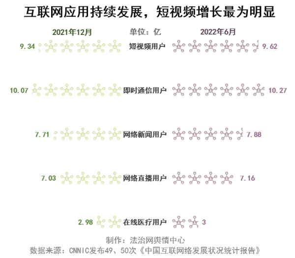 從總體規(guī)模來(lái)看,即時(shí)通信用戶規(guī)模達(dá)10.27億,占網(wǎng)民整體的97.7%。短視頻用戶緊隨其后,占網(wǎng)民整體的91.5%。網(wǎng)絡(luò)新聞?dòng)脩粽季W(wǎng)民整體的75.0%。網(wǎng)絡(luò)直播用戶占網(wǎng)民整體的68.1%。在線醫(yī)療用戶占網(wǎng)民整體的28.5%,隨著在線醫(yī)療需求的不斷釋放,在線醫(yī)療行業(yè)呈現(xiàn)出高速發(fā)展態(tài)勢(shì),截至2022年6月,在線醫(yī)療用戶規(guī)模較2021年6月增長(zhǎng)5991萬(wàn)。