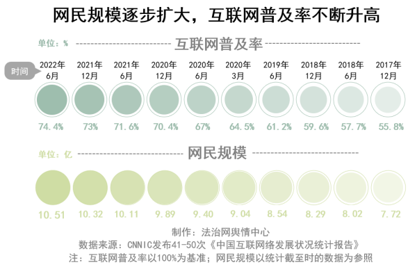 隨著互聯(lián)網(wǎng)的不斷普及,我國(guó)網(wǎng)民規(guī)模持續(xù)增長(zhǎng)。據(jù)41次-50次(2017年12月-2022年6月)《報(bào)告》顯示,截至2022年6月,我國(guó)互聯(lián)網(wǎng)普及率已達(dá)74.4%,較2021年12月提升1.4個(gè)百分點(diǎn),網(wǎng)民規(guī)模達(dá)10.51億。
