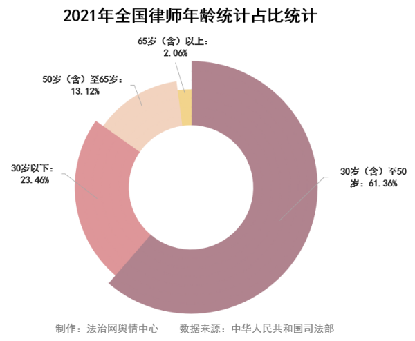 從年齡結(jié)構來看,律師行業(yè)處于老中青共存階段。其中,30歲-50歲律師占比最高,達61.36%,30歲以下律師占比達23.46%,律師隊伍年輕化趨勢明顯。