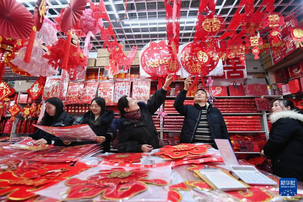 1月20日,人們在河北省石家莊市南三條年貨批發(fā)市場選購春節(jié)飾品。新華社發(fā)(梁子棟攝)