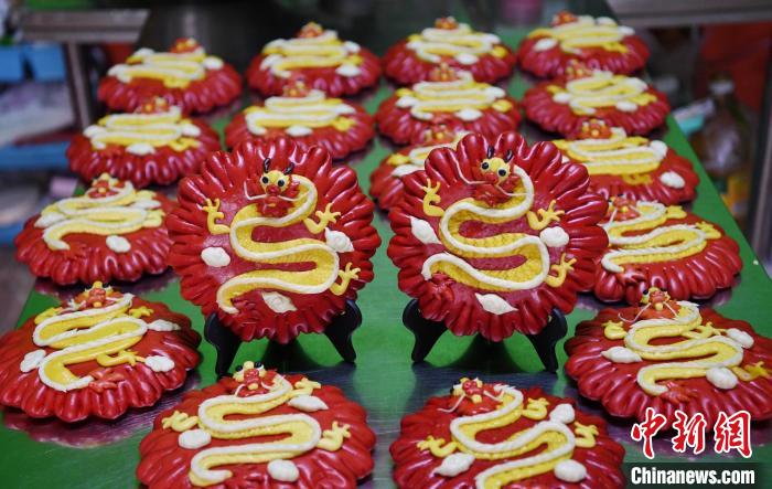 在我國(guó)北方地區(qū),大多有著“過(guò)大年,發(fā)面蒸花饃”的年俗,其中“發(fā)”,寓意新的一年發(fā)家發(fā)財(cái),“蒸”寓意來(lái)年日子蒸蒸日上。臨近春節(jié),河北省定州市民間手藝人蘇利榮和同事們也忙碌了起來(lái),憑借著專(zhuān)業(yè)的面點(diǎn)技術(shù),一塊塊柔軟的面團(tuán),在她們的手中變身為造型各異的創(chuàng)意花饃。為迎接龍年的到來(lái),她們專(zhuān)門(mén)設(shè)計(jì)蒸制了帶有“龍”元素的花饃,“龍鳳呈祥”“金龍送?!薄褒埬甏蠹薄螒B(tài)各異、喜慶吉祥的花饃傳遞著濃濃的年味兒。(文/李玉素 圖/白永民)