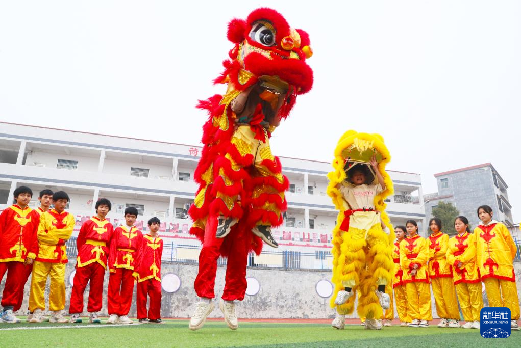 1月15日,湖南省永州市新田縣蓮花學(xué)校學(xué)生在老師指導(dǎo)下練習(xí)舞獅。