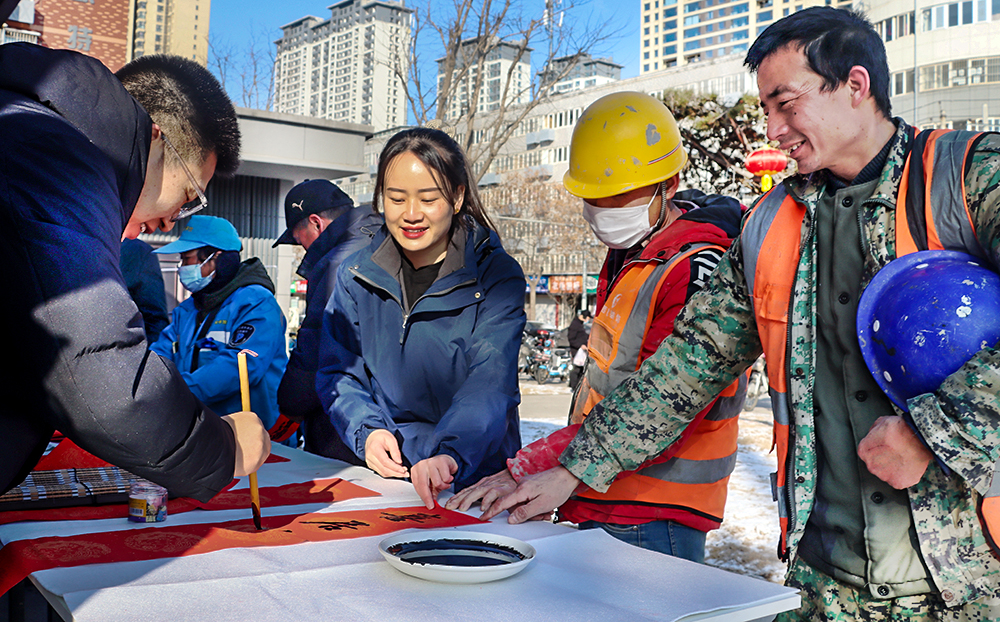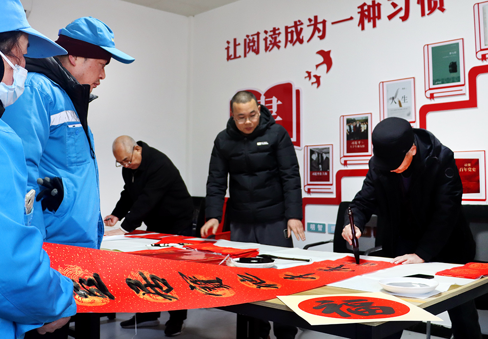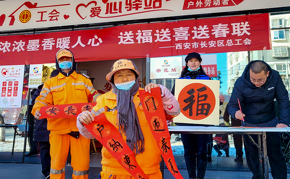 活動現(xiàn)場,長安區(qū)總工會邀請的多位知名書法家現(xiàn)場揮毫潑墨,把對新春的美好愿望傾注筆尖,書寫出一副副寓意美好、包含祝福的春聯(lián)和“福”。驛站周邊的環(huán)衛(wèi)工人、停車收費員,快遞小哥及市民群眾,高興地挑“福”字、選春聯(lián),提前感受到了濃濃的“年味”