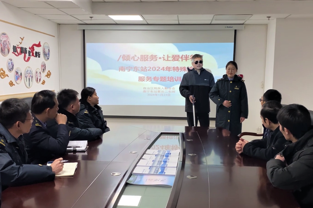春運大幕開啟前,在南寧東站上演了一場特殊的培訓(xùn)課。特殊的是,培訓(xùn)老師是一位視力障礙旅客,他拄著盲棍示意,將與視力障礙人士相處的注意事項一一道來,并帶領(lǐng)培訓(xùn)學(xué)員在車站內(nèi)進行了實踐。而參加培訓(xùn)的學(xué)員,是一支由10名客運員組成的南寧東站“幫幫盲”團隊。