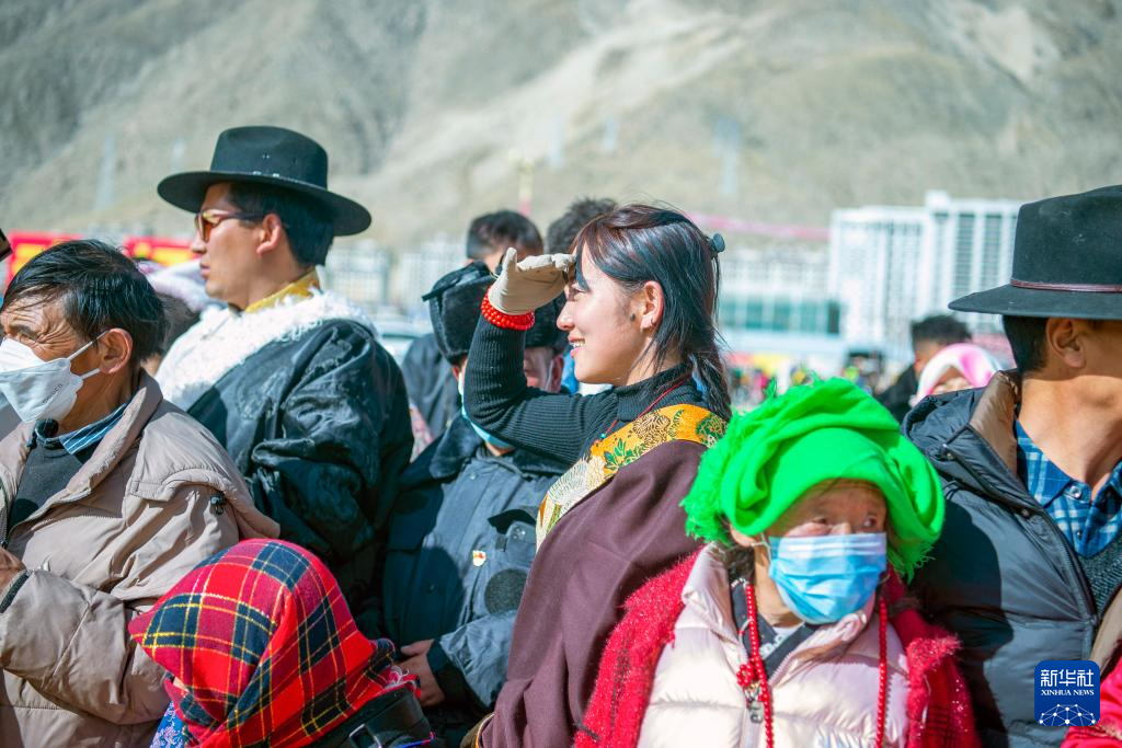 丹增(中)在森布日生態(tài)搬遷安置點(diǎn)觀看賽馬活動(dòng)(1月24日攝)。
