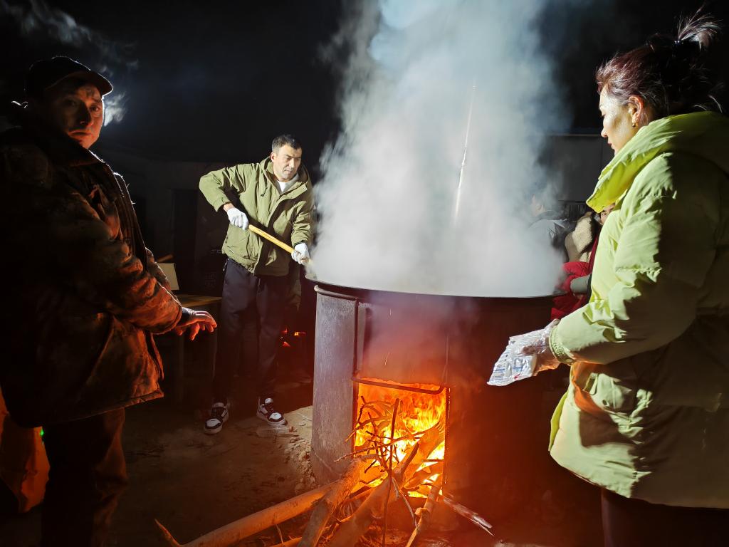 1月23日,志愿者正在喀拉蘇村安置點為受災(zāi)群眾烹飪美食。新華社記者茍立鋒 攝