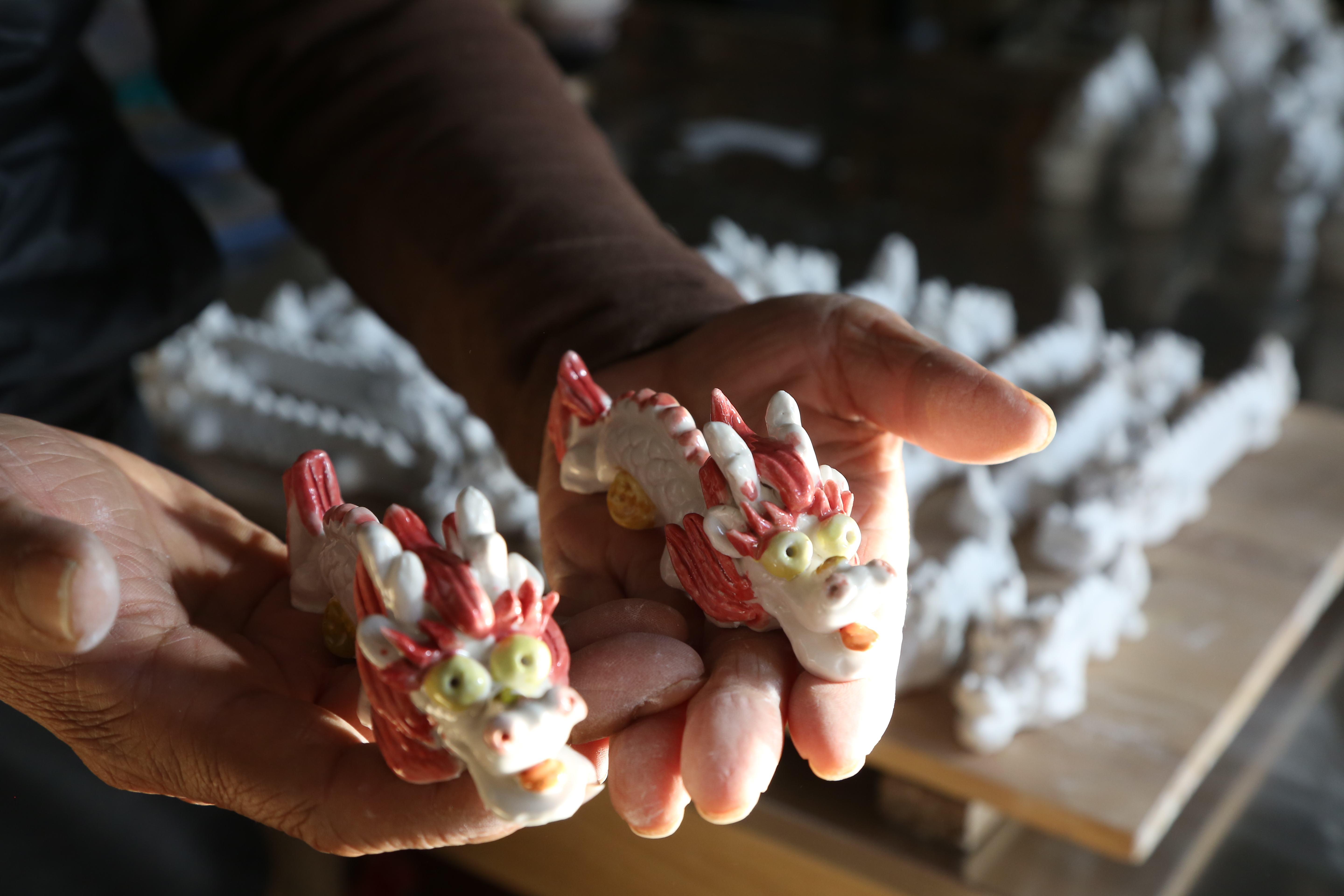 “這件泥塑取名‘一條好龍’,寓意新的一年萬事順遂;這件叫‘大嘴龍’,寓意風調(diào)雨順;這是十二生肖龍……”隨著龍年春節(jié)的臨近,史月明創(chuàng)作了一系列以龍為主題的泥塑作品。