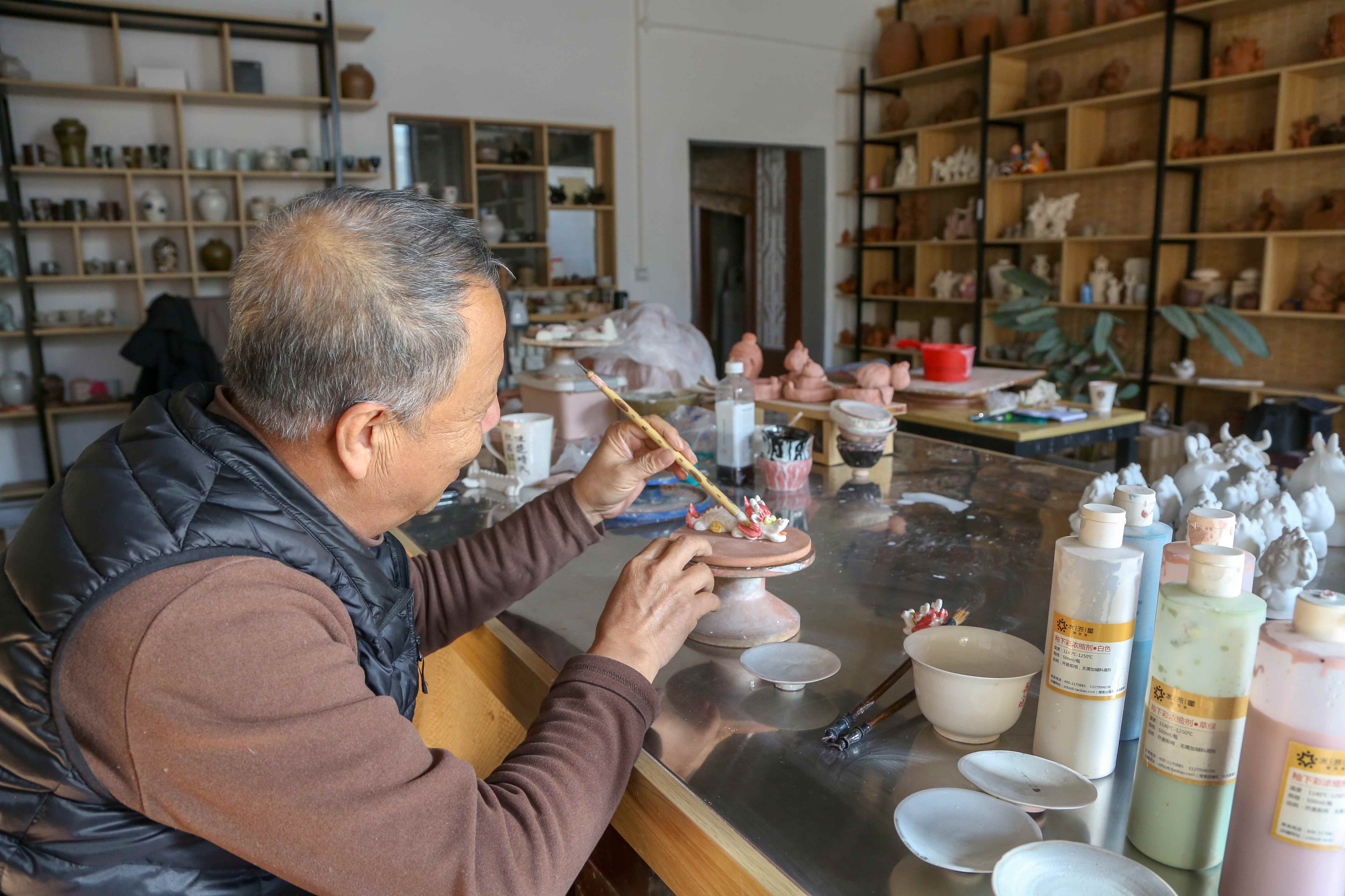 一抔泥土、一把刻刀,經(jīng)巧手捏制、刻畫、修整、彩繪、燒制等多道工序后,一個個活靈活現(xiàn)、寓意吉祥的泥塑作品便制作完成了。