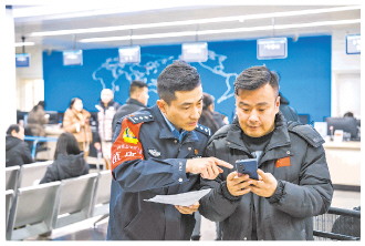 圖為民警現(xiàn)場(chǎng)指導(dǎo)群眾通過“西安出入境”微信公眾號(hào)辦理相關(guān)業(yè)務(wù)。