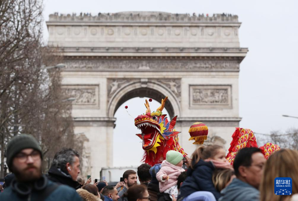 2月4日,人們?cè)诜▏?guó)巴黎香榭麗舍大街觀看舞龍舞獅表演。