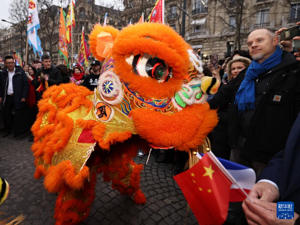 2月4日,人們?cè)诜▏?guó)巴黎香榭麗舍大街觀看舞龍舞獅表演。