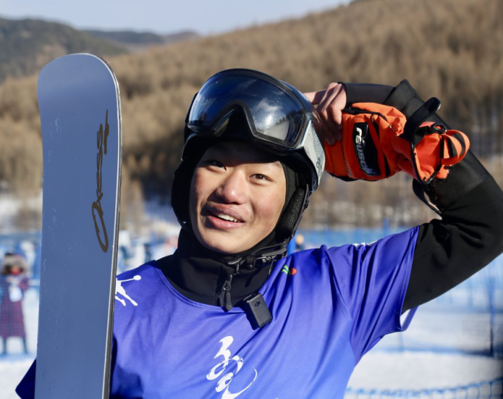 單板滑雪青年組男子平行大回轉(zhuǎn)比賽冠軍獲得者彭玥熙。