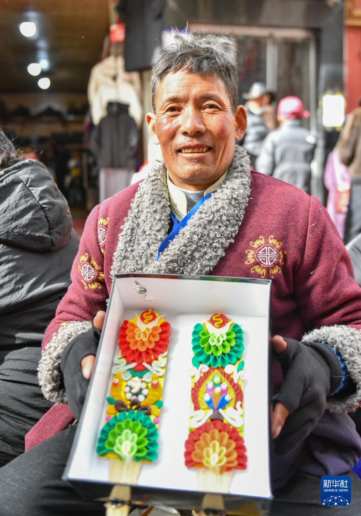 藏歷新年臨近,拉薩年貨市場(chǎng)上酥油花熱銷。酥油花以酥油為主要原料,手工精雕細(xì)捏而成,造型多樣,色彩豐富。
