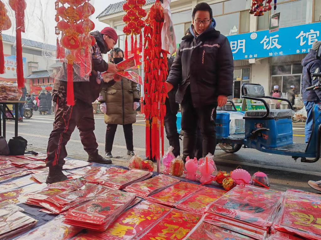“每年小年一過,這大集是越趕越紅火。貼春聯(lián)是傳統(tǒng)年俗,家家戶戶都要買?!碧锸所i說著,為自家也選定了一副:萬事如意財運來,新春大吉福門開?!靶碌囊荒?,求財、求運、求福。”他笑道。出攤一上午,這位42歲的攤主在收付款到賬聲中忙得不亦樂乎。