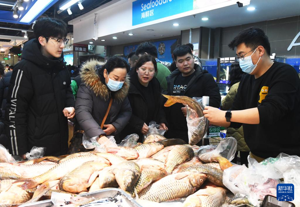 2月7日,顧客在河北石家莊新樂市一家超市選購海鮮產(chǎn)品。